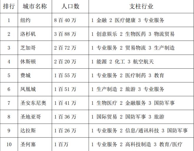 全美人口最多的10大城市及主要支柱行業(來源:Ballotpedia, city-data.com)