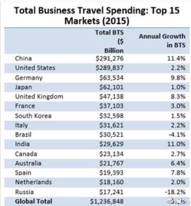 根據GBTA基金會2015年數據,中國與美國基本并列全球兩個最大的商旅出差市場——各自的年度總花費約在 3000億美元左右。