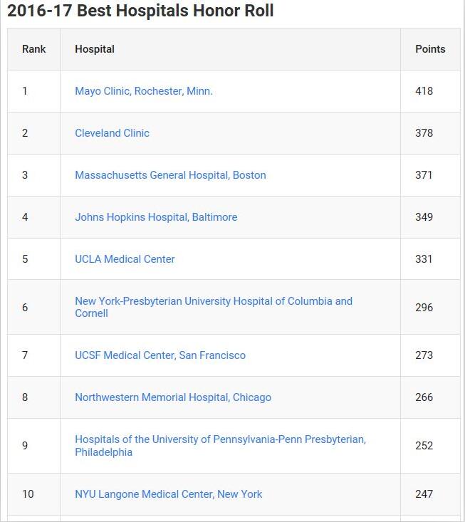 其中除了排名第4,位于華盛頓周邊巴爾的摩的John Hopkings醫院之外,其它9個都散布于全美各地。從醫療資源分布來看,首都華盛頓并未一枝獨秀,在美國其它地區依然可以享受有高水準的醫療服務。