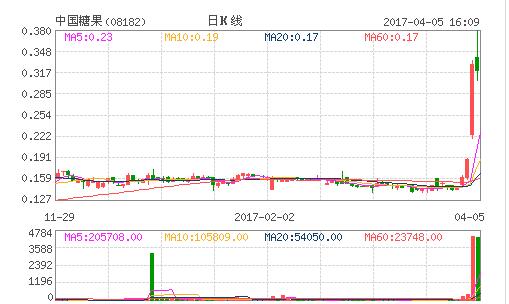 中國糖果(8182)周一復牌后大升75.5%,股價全日走高,升0.142元,收報0.33元,全日成交額達1.32億元。