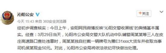 人民網北京4月5日電 據河南省沁陽市公安局官方微博通報,經初步調查核實,安陽網民微博反映“沁陽交警收黑錢”的輿情基本屬實。沁陽市公安局將依法依紀盡快做出處理。