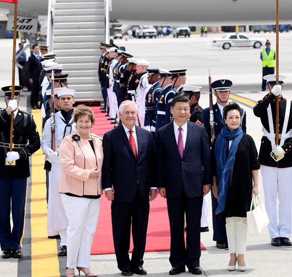 4月6日,國家主席習近平乘專機抵達美國佛羅里達州,將在海湖莊園同美國總統特朗普舉行中美元首會晤。習近平和夫人彭麗媛受到美國國務卿蒂勒森夫婦等熱情迎接。新華社記者 吳曉凌 攝