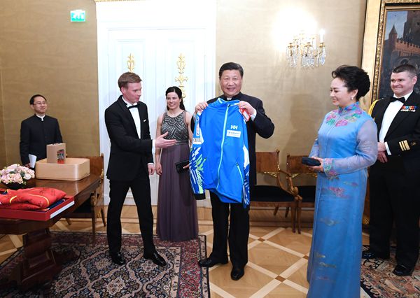 習近平同尼尼斯托總統會見中芬冰雪健兒時,芬蘭運動員向習近平和夫人彭麗媛贈送運動衣。新華社