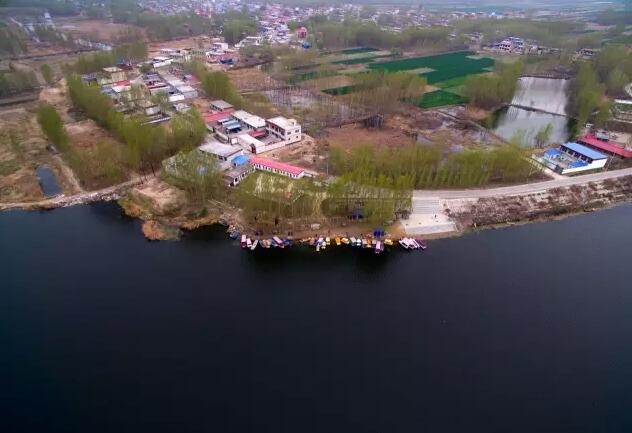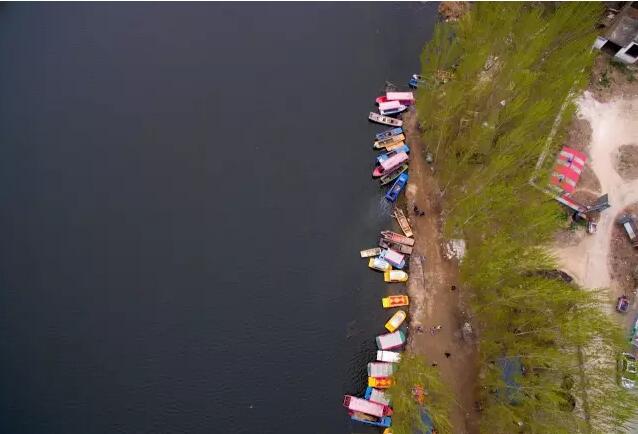 堤壩邊停放著數十艘小船,是岸邊村民的漁船,或是供游客下水游玩的小型游船。