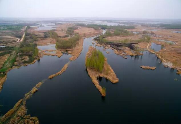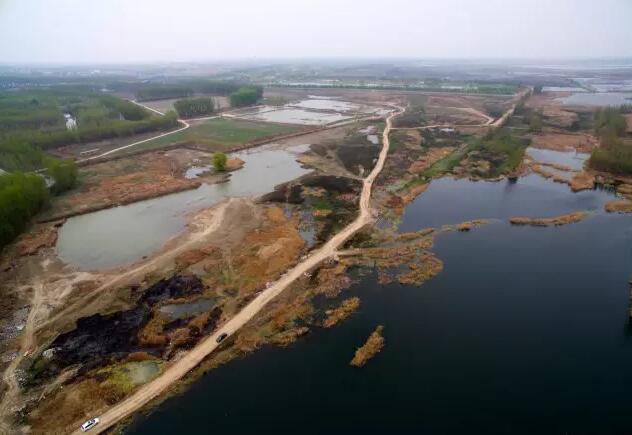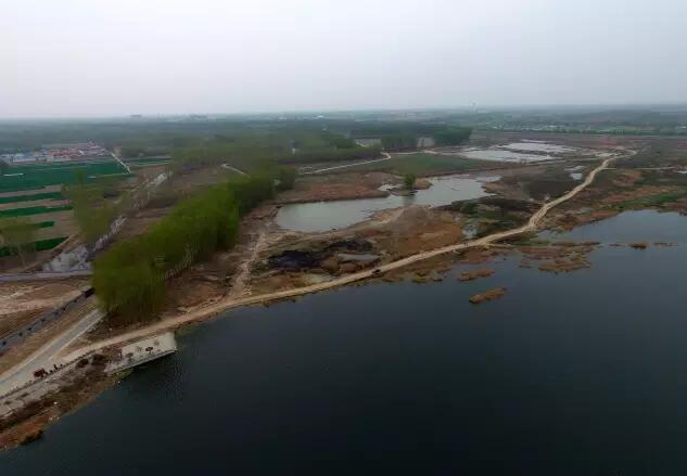 從容城縣留通村遠眺白洋淀,堤壩、陸地、大小淀泊相互交織,構成了獨特的水域生態。