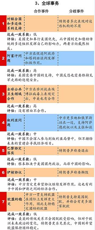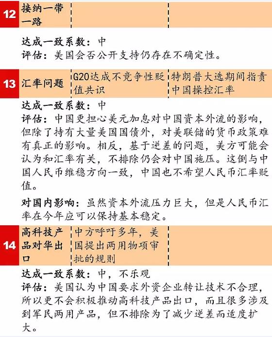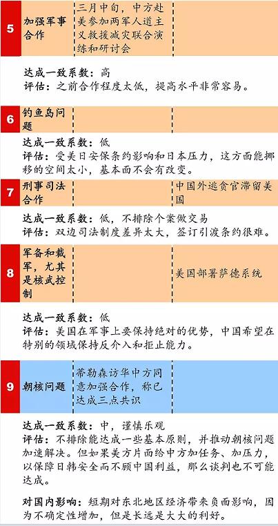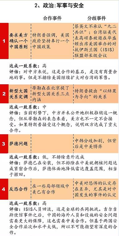 本清單從政治、經濟和全球事務三個方面,全面梳理中美之間的合作和分歧事項,並評估其達成合作的可能性(注:圖中藍色表示主要是由美國推動的議程,而黃色則表示中國更關心的議程)。