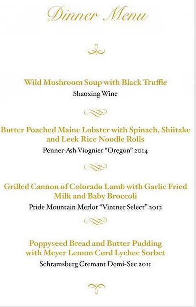 根據白宮公開的餐單,晚宴前菜為凱撒沙律,主菜可選香煎比目魚扒或紐約長牛扒,更有朱古力蛋糕及檸檬、芒果和紅莓雪芭作甜品,餐酒則為2014年出產的紅酒及白酒。