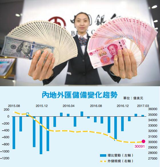 【香港商報網訊】人行昨日公布的數據顯示,內地3月外匯儲備30091億美元,環比增加39.64億美元,連續第二個月上升,前值30051億美元。3月外匯儲備22177.04億SDR,前值22196.18億SDR。這是外儲自去年4月以來首次連續兩個月上升。2017年一季度,中國外匯儲備規模下降14億美元,較前兩季度降幅顯著縮小。