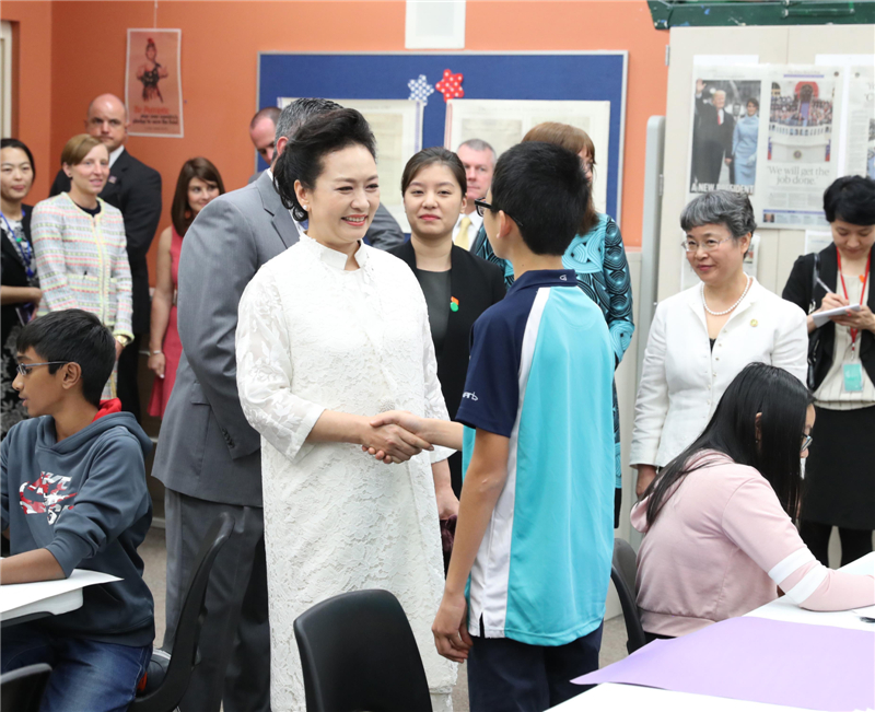 當地時間4月7日上午,應美國總統夫人梅拉尼婭邀請,國家主席習近平夫人彭麗媛參觀位於佛羅里達州西棕櫚灘市的巴克藝術中學。這是彭麗媛在觀摩時政經濟課後同一名華裔學生親切交談。新華社