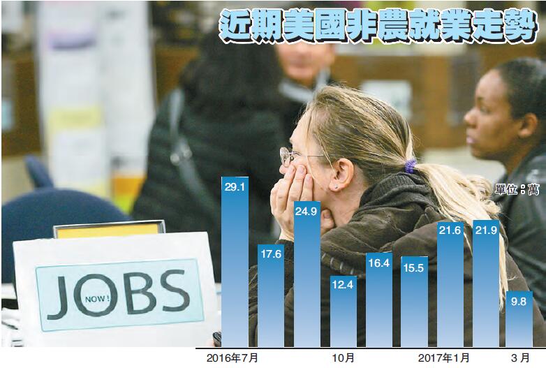 【香港商報网訊】美國3月非農就業人口僅增加9.8萬,創2016年5月來最低水平,且遠不及分析員預期值增加18萬,較之前值21.9萬也是急劇下降。有市場分析師認為,新增職位疲弱或將令聯儲局在未來加息問題上更趨向謹慎,加息步伐并有可能放緩。利率期貨也顯示,6月加息的概率已下降,聯儲局有可能要到9月才會再度加息。