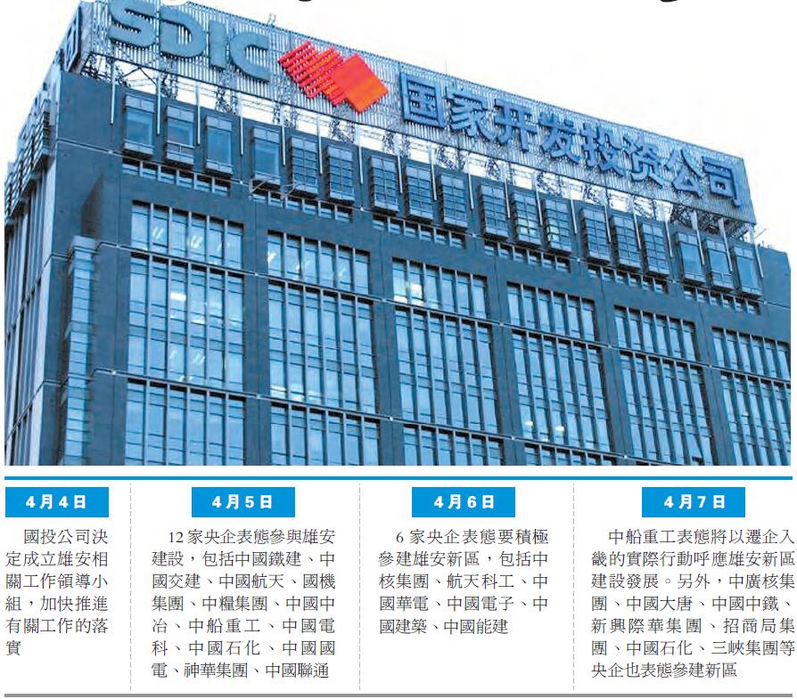 在這些央企中,已有包括中電集團、華電集團、中國聯通、國投公司、中國鐵建等至少9家央企宣布,將成立對接雄安新區建設的領導小組。