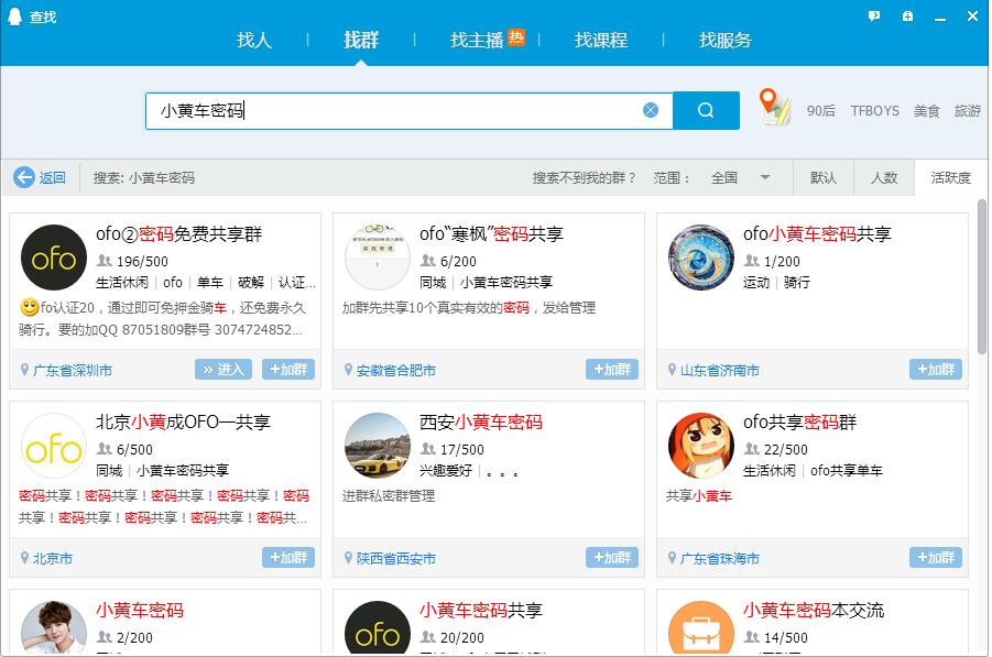 除了這些共享平臺之外,QQ群也是單車共享密碼的一個重灾區,@懂懂筆記通過在QQ上泛搜索“ofo小黃車密碼共享”,發現了大量小黃車密碼共享群。這些群大多數會爲新成員提供一到兩次的免費開鎖機會,超出次數之後則需要向專門的“管理員”付費解鎖(3~5毛錢一次)。而且,衆多密碼共享群中還不乏一些需要先付費才能加入的“高級群”。