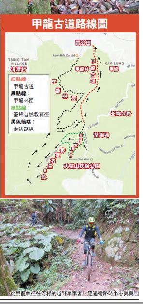 訪古道,最便捷的途徑是到達漁護署荃錦管理站後,循右邊方向的自然教育徑往甲龍古道,這條路線亦可到甲龍林徑,但到分支位時不要走入林徑,而是一直走古道到雷公田,全程不需兩小時。不過,記者走訪時,轉向一條較長路線,為的是要看看越野單車奔馳情況。