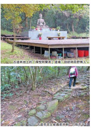由古道到雷公田,都是下坡路,石徑大致保存良好,蜿蜒而下,像極一條灰色大蛇。經歷長久的風雨侵擾,石頭變得圓滑,但一些路段的泥土地卻被沖刷過度,出現凹陷,令古道石階更見突出。古道途中亦有山澗,但兩邊岩石頗為濕滑,不宜久留。在接近雷公田時,左方發現明顯大道,進內一看,見有清佛像前供奉鮮艷花朵,顯見有人定時打理。翻查資料,這道場名「禪悅阿蘭若」,為禪修道場。