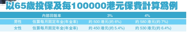 以年屆65歲投保、及每10萬元投保金額計算,每名男性每月固定年金,最多達580元,折合年金率達7%;每名女性每月固定年金,最多為530元,折合年金率6.4%(詳見附表)。