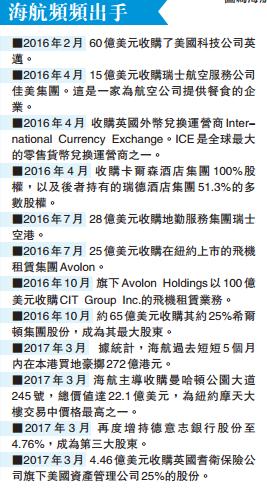 《金融時報》的一項研究發現,自今年年初以來,海航至少參與了12宗併購交易案,包括洽購瑞士機場零售商Dufry、美國商業雜誌《福布斯》以及德國國有銀行HSHNordbank的一定數量的股份。
