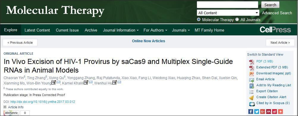 美国《分子治疗》杂志近日刊登了美国天普大学华人科学家胡文辉等人的最新研究成果:他们利用基因编辑技术,从多靶点高效剔除了一种人源化小鼠多个器官组织中的人类艾滋病病毒,推动基因疗法治疗艾滋病向人体临床试验迈出重要一步。在之前的研究中,胡文辉团队已成功利用基因编辑技术,有效清除了体外培养的人类细胞系、艾滋病患者体内取出的T免疫细胞以及转基因小鼠体内的艾滋病病毒。