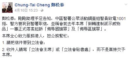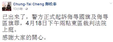 【香港商报网讯】熱血公民立法會議員鄭松泰去年10月在立法會會議廳內,將建制派議員放置的國旗和區旗倒轉,警方其後接手調查。昨晚他在社交媒體facebook「自爆」被警方上前拘捕,直至凌晨約1時,他在中區警署離開,表示案件將於下周二4月18日,即復活節假後到東區法院提堂,而警方以侮辱國旗及侮辱區旗罪起訴。
