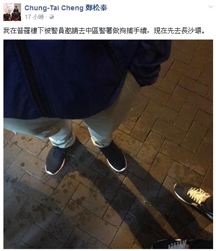 現場大批熱血公民支持者到場,手持直幡,聲援鄭松泰,警員在現場搜身。鄭表示,被捕時自己正前往開網台,在深水埗商業大廈外,遭警方中區警署公眾活動調查組拘捕,他指現場有14至15個警員左右。