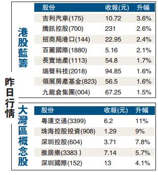 中央將制訂粵港澳大灣區發展規劃,是繼雄安新區后市場另一炒作焦點,相關股份大受追捧。粵運交通(3399)昨飆逾11%,珠海控股投資(908)升逾9%,深圳控股(604)升7.8%;深圳國際(152)升逾4%。