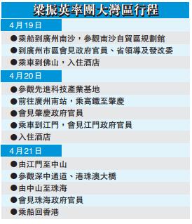 另外,為加強特區官員對粵港澳大灣區內城市的認識,行政長官梁振英(CY)將於下星期三(19日)率團前往大灣區其中6個城市,包括廣州、佛山、肇慶、江門、中山及珠海,考察3日。隨行的包括政務司司長張建宗,財政司司長陳茂波,及部分局長與副局長,以及部分立法會議員、專業人士及商會代表等。