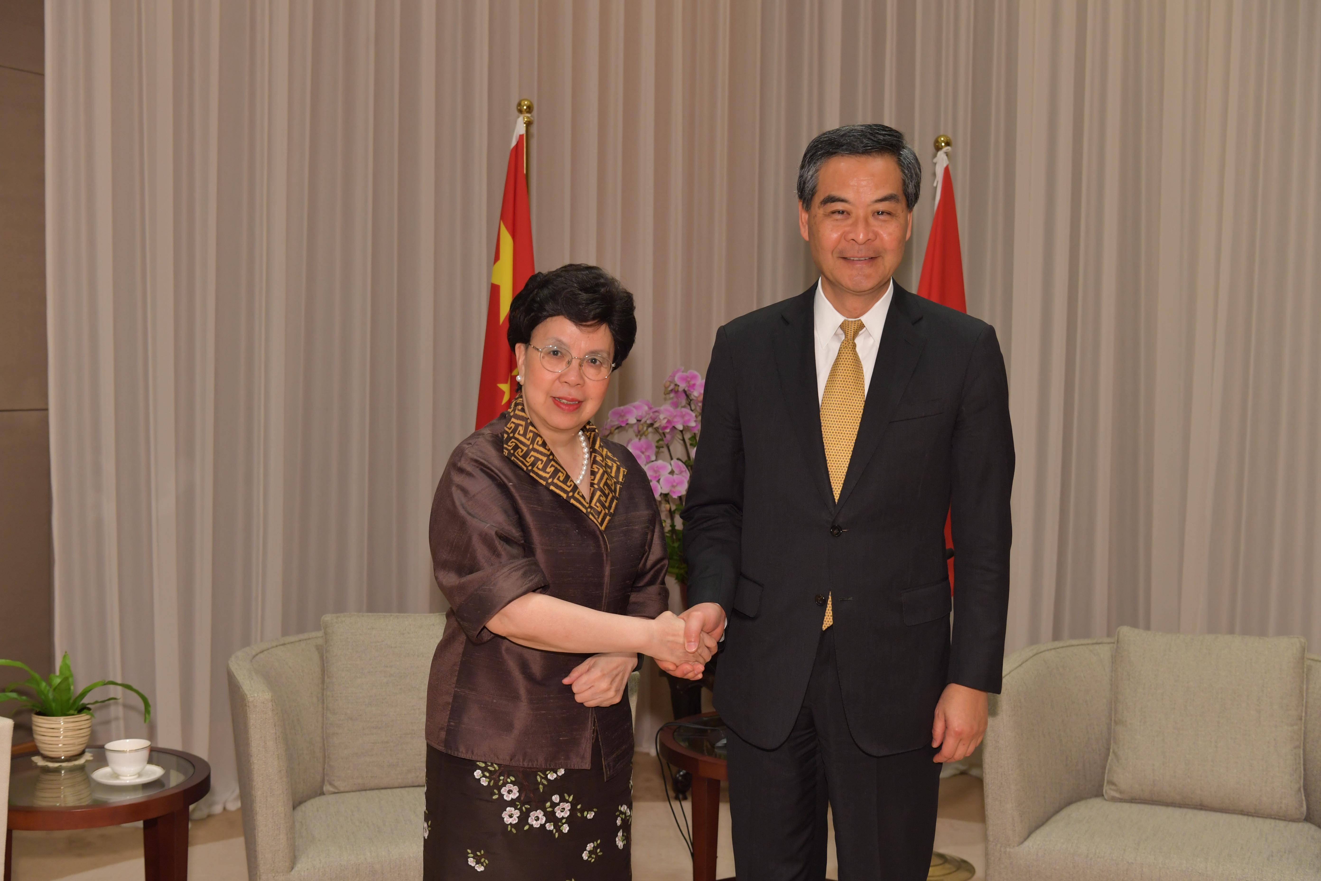 【香港商報网訊】行政長官梁振英(CY)昨早在行政長官辦公室與到訪的世界衛生組織總幹事陳馮富珍會面,就雙方共同關心的課題交換意見。