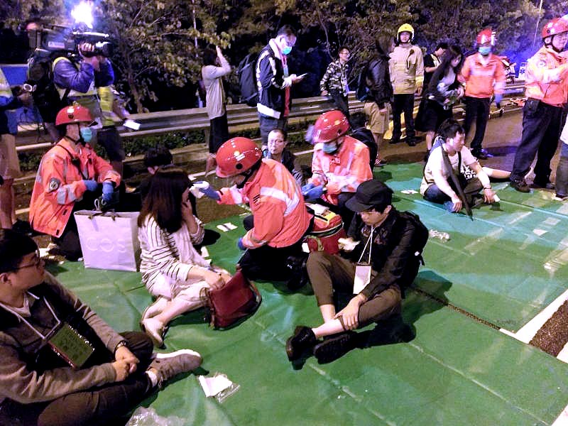 意外發生後,一名坐於城巴上層左邊車頭旳女乘客被撞凹的車身夾傷雙腳被困,無法動彈,及後雖由馳至消防員協助救出送院。意外中共有至少55人受傷,消防處派出至少22輛救護車到場,先將重傷者送院,輕傷者被安排坐在路邊等候,救護員在現場鋪上「紅、黃、綠」三色膠墊,依據傷者傷勢分流。