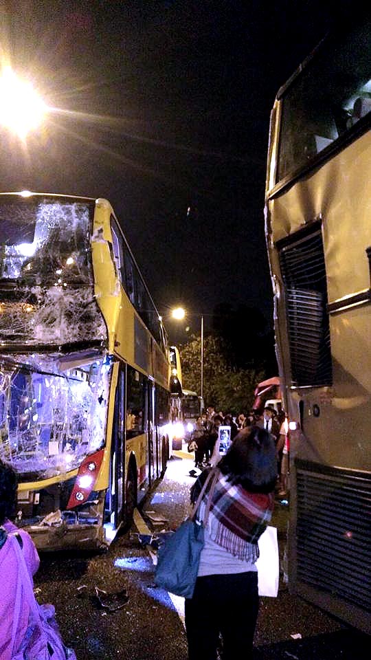 另一名九巴乘客吳小姐則稱,事發時車長急煞車,未幾遭尾隨城巴狂撼,她形容撞擊力很大,下層所有乘客也倒地受傷,「全部人碌晒地,有人起唔到身!」其後又有乘客指巴士冒煙,傷者們聞言大驚,紛紛逃離車廂免立危牆之下。