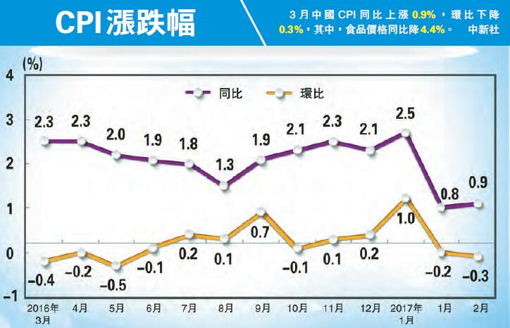 國家統計局昨日公布的數據顯示,2017年3月份,全國居民消費價格指數(CPI)同比上漲0.9%,低於預期的1%,較前值0.8%小幅反彈;3月份工業生產者出廠價格指數(PPI)同比上漲7.6%,環比上漲0.3%,環比漲幅連續三個月回落。接受本報採訪專家認為,CPI同比小幅上升,主要受基數效應和非食品價格上漲的影響。整體而言,物價上漲水平較為溫和,隨著翹尾因素逐漸減弱,CPI在下半年將會有所回升,而PPI也將會逐步回落,所以沒必要運用貨幣政策進行調整。香港商報記者 朱輝豪
