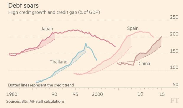 不過,這引發了一個大問題:中國會實現所需的再平衡么?中國在維持穩定增長的同時出現了債務爆炸式增長,這在2007至2008年金融危機及隨后的歐元區危機之前的西方也同樣發生過。正如國際貨幣基金組織(IMF)一篇論文強調的:“在2009年到2015年之間,信貸平均每年增長20%左右,大大高于名義GDP增長率及此前的增長趨勢。”這一圖景與危機前的日本、泰國和西班牙有著令人不安的相似性。