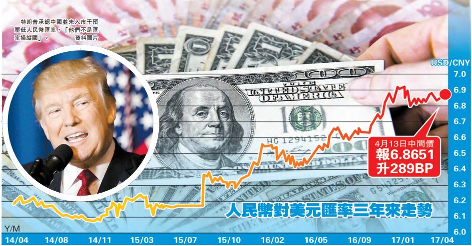 特朗普有關中國的最新表態也理所當然地攪動了金融市場。他的「中國不是匯率操縱國」言論發出之后,本港時間4月13日,離岸人民幣對美元即期匯率在紐約尾盤即刻上漲了167個基點,而中國官方當日公布的人民幣對美元匯率中間價則較前一交易日大漲289個基點,報於6.8651,創近3個月來最大升幅。