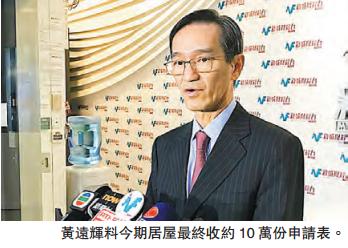 黃遠輝昨早出席新城節目時表示,樂富房委會服務中心收到的居屋認購申請表,尚未計算郵寄和在屋恏辦事處遞交的,預料最終或會收到約10萬張申請表。他認為今輪居屋認購反應與預期差不多,因今次與之前兩期的樓價周期相似,都是處於樓價有機會上升的階段,吸引部分無法負擔私樓樓價的家庭申請。