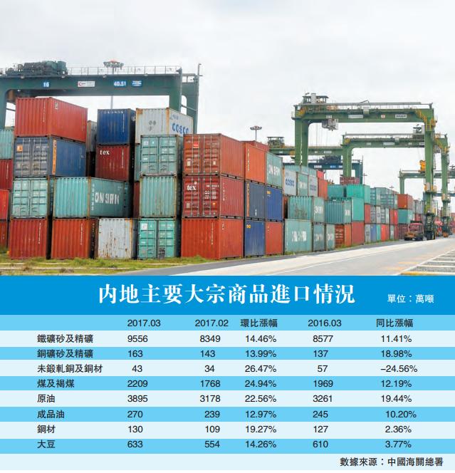海關總署數據顯示,3月,鐵礦石、原油、成品油進口數量增速均明顯提升,大豆、鋼材進口數量增速則有所回落,內地需求繼續處於較高水平。其中,鐵礦石和原油的進口增長非常突出。由於民營煉廠進口量進一步增加,當月原油進口量達到歷史最高記錄,鐵礦石單月進口規模則刷新歷史次高記錄。