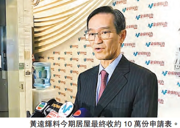 黃遠輝昨早出席新城節目時表示,樂富房委會服務中心收到的居屋認購申請表,尚未計算郵寄和在屋恏辦事處遞交的,預料最終或會收到約10萬張申請表。他認為今輪居屋認購反應與預期差不多,因今次與之前兩期的樓價周期相似,都是處於樓價有機會上升的階段,吸引部分無法負擔私樓樓價的家庭申請。
