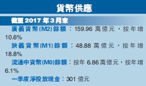 數據顯示,3月末,內地M2餘額159.96萬億元,同比增長10.6%,增速分別比上月末和上年同期低0.5個和2.8個百分點;M1餘額48.88萬億元,同比增長18.8%,增速分別比上月末和上年同期低2.6個和3.3個百分點;流通中貨幣(M0)餘額6.86萬億元,同比增長6.1%。一季度淨投放現金301億元。