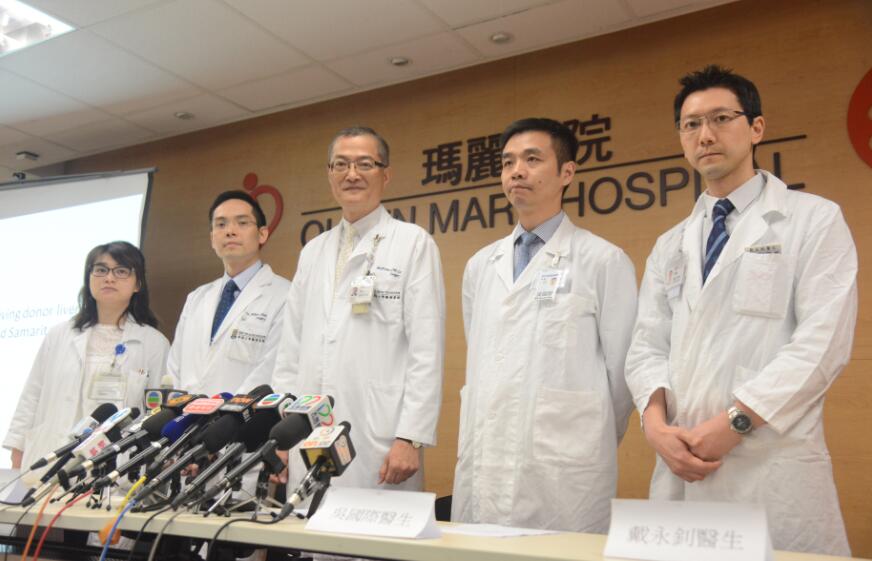 左起:瑪麗醫院肝移植團隊冼瑞靈、陳智仁、盧寵茂、吳國際及戴永釗出席記者會講述手術情況。記者蔡啟文攝
