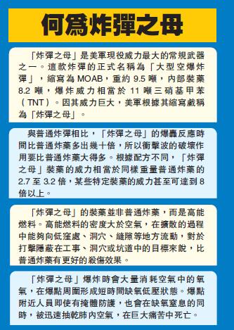 GBU-43炸彈重9.5噸,綽號「炸彈之母」。這是美軍首次在實戰中動用這種大型炸彈,該炸彈也是美軍在作戰中所用最大的非核炸彈。路透社