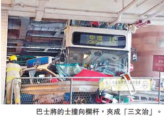 昨日下午2時許,一輛15號新巴離開山頂廣場公共交通總站,準備前往交易廣場時,未料突然失控,攔腰猛撞向前方一輛的士,巴士上層車頂更撞及牆身,的士被撞向路旁欄杆,如「三文治」被夾,左邊車門被撞至飛脫,左前胎扭曲,車頭外殼全毀,機件散滿地上,的士恍如廢鐵,姓李司機及後座一名乘客被困,坐在前座乘客則踢毀玻璃窗自行爬出,站內途人見狀報警。