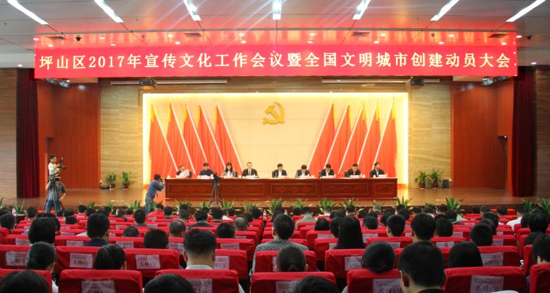【香港商报网讯】记者焦家志 通讯员梁子聪赵璐报道: 4月14日,深圳市坪山区召开了“坪山区2017年宣传文化工作会议暨全国文明城市创建动员大会”。会议由坪山区委副书记、区长陶永欣主持,区委常委、宣传部部长吴筠作宣传文化工作报告,区领导孙新华、李映中、赖武、黄泽琳、刘国红、韩立清参加会议,区人大、区政协、区纪委、区法院、区检察院、各街道、区直单位、驻区单位、区属企业相关负责人、新闻发言人、新闻助理、通讯员以及驻区媒体记者300余人参加会议。