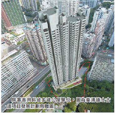 以德士古道資助房屋項目為例,其總地盤面積約4600平方米,但可建樓宇的淨地盤面積卻只有約2460平方米,通過上述善用斜坡的方法,淨地盤面積增加約1050平方米,該項目的建屋量由原來約350個單位增加至約500個單位。