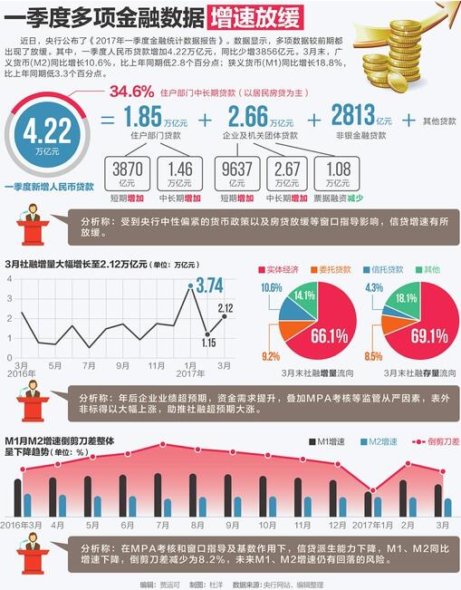 近日,央行公布了《2017年一季度金融統計數據報告》。數據顯示,多項數據較前期都出現了放緩。其中,一季度人民幣貸款增加4.22萬億元,同比少增3856億元。3月末,廣義貨幣(M2)同比增長10.6%,比上年同期低2.8個百分點;狹義貨幣(M1)同比增長18.8%,比上年同期低3.3個百分點。