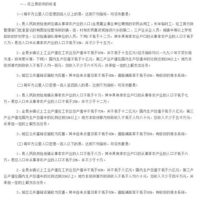 說起來這項改革由來已久,1986年國務院轉批民政部《關于調整設市標準和市領導縣條件的報告》規定:非農業人口6萬以上,年國民生產總值2億元以上,已成為該地經濟中心的鎮,可以設置市的建制。1993年國務院轉批民政部《關于調整設市標準的報告》對撤縣設市有了更詳細的標準,包含了人口、GDP、財政收入等眾多指標。