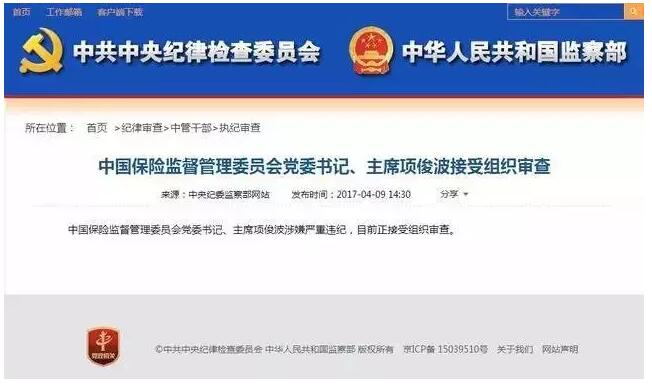 當天下午公告出來后,保監會迅速召開了黨委會議,向保監會黨組成員通報了黨中央對項俊波涉嫌嚴重違紀進行組織審查的決定。次日,又連開兩場會議,分別向保監會機關各部門、會管單位主要負責人和各保監局通報了該決定,要求堅決擁護和服從黨中央決定,貫徹黨中央、國務院的重大決策部署,維護保險業改革發展穩定大局。
