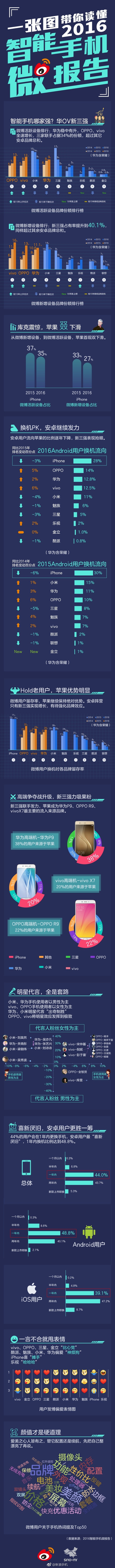 4月17日,微博与知名市场调研公司赛诺联合发布《2016年智能手机微报告》(以下简称“报告”),基于对2016年微博用户活跃行为数据的定量分析,深度反映中国智能手机市场格局的变化。报告显示,华为、OPPO、vivo三大国产品牌已形成“三足鼎立”的新格局,苹果的优势则继续遭到蚕食。