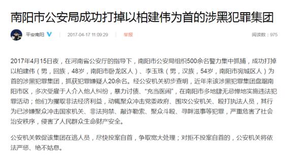 4月17日上午,“平安南陽”微信公眾號對外發布:2017年4月15日夜,在河南省公安廳的指導下,南陽市公安局組織500余名警力集中抓捕,成功打掉以柏建偉(男,回族,48歲,南陽市臥龍區人)、李玉珠(男,漢族,54歲,南陽市宛城區人)為首的涉黑犯罪集團,抓獲犯罪嫌疑人20余名。經公安機關初步查明,近年來該涉黑犯罪集團盤踞南陽市區,多次受雇于人介入他人糾紛,暴力討債、充當醫鬧,在南陽市多地肆無忌憚地實施違法犯罪活動;他們為攫取非法經濟利益,動輒聚眾沖擊黨委政府、圍攻公安機關、毆打執法人員,其行為已涉嫌聚眾沖擊國家機關、非法拘禁、敲詐勒索、聚眾斗毆、尋釁滋事等犯罪,嚴重危害了社會治安秩序,侵害了人民群眾生命財產安全。