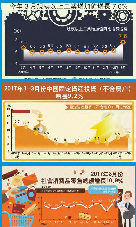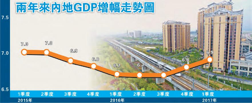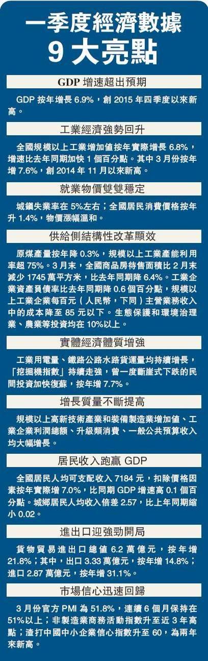 昨早,國家統計局發布一季度經濟數據,內地GDP當季按年增長6.9%,好於市場預期。專家表示,一季度GDP數據向好,得益於政府加大了投資力度,供給側改革取得了一定成效以及外部環境復蘇等多重因素。至於GDP增速是否可持續,則需看中國城鎮化進程中投資項目的成效,以及未來居民消費增長和收入增長情况。
