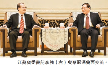 蔡冠深向江蘇省領導介紹中總最新會務發展情况,指該會新一屆會董會剛於去年底就任,除了秉承「立足香港,背靠祖國,面向世界」的宗旨外,更希望將中總定位為中國的香港中華總商會,讓中總不單為香港工商界服務,更能通過香港「一國兩制」以及高度國制化的優勢,在國家的經濟發展中發揮更大的作用。