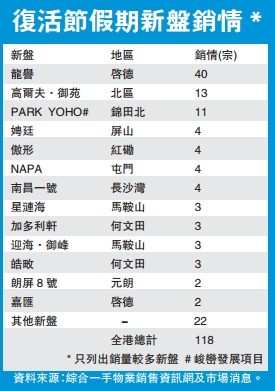 「珀御」之外,新盤市場焦點落於保利置業(119)啟德「龍譽」上。該盤早前加售93伙,為今個復活節檔期新貨源最多新盤。截至周日晚上約8時,「龍譽」復活節檔期賣出40伙,為銷情最好一手盤。緊隨其后為恒地(012)粉嶺「高爾夫·御苑」及新地(016)元朗「PARK YOHO」系列分別賣出13伙及111伙。
