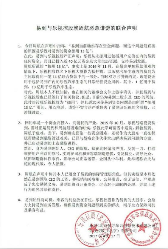 4月17日晚間,樂視和易到發布聯合聲明稱,樂視從未挪用過包括用戶充值在內的易到任何資金,而且已投入近40億元資金及大量生態資源,支持易到發展。