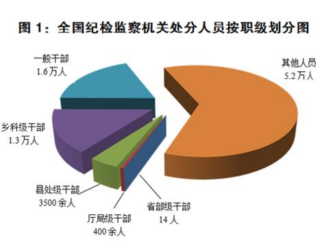 2017年第一季度,全國紀檢監察機關共接受信訪舉報62.3萬件次,處置問題線索19.4萬件,談話函詢3.8萬件次,立案10.2萬件,處分8.5萬人(其中黨紀處分7.1萬人)。處分省部級干部14人,廳局級干部400余人,縣處級干部3500余人,鄉科級干部1.3萬人,一般干部1.6萬人,農村、企業等其他人員5.2萬人。